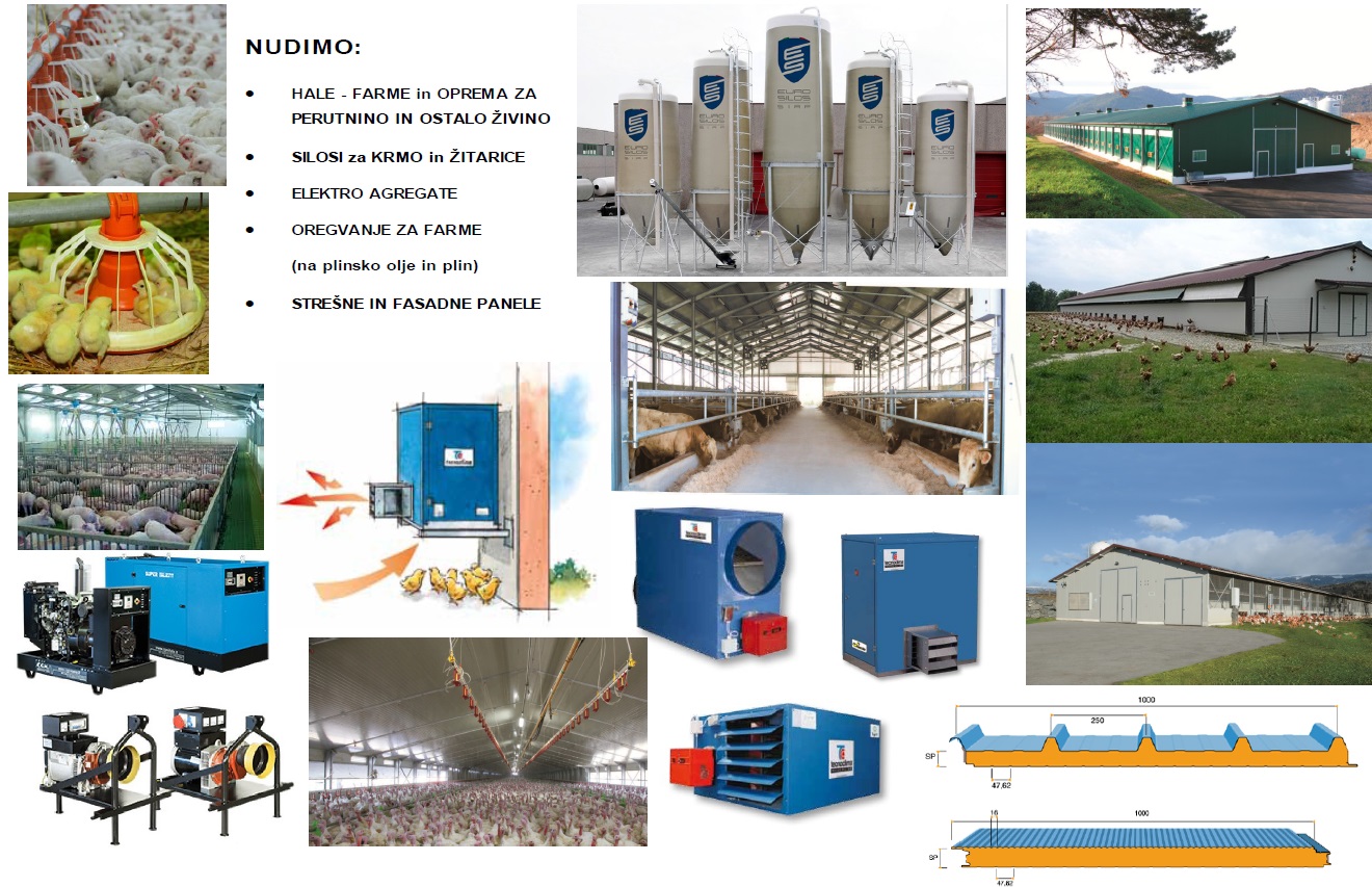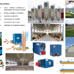 Silosi za žitarice Hale - farme za piščance Elektro agregati Grelni sistemi za farme Tehtalni sistemi L.C. Pese Nipli Teca - Roxel